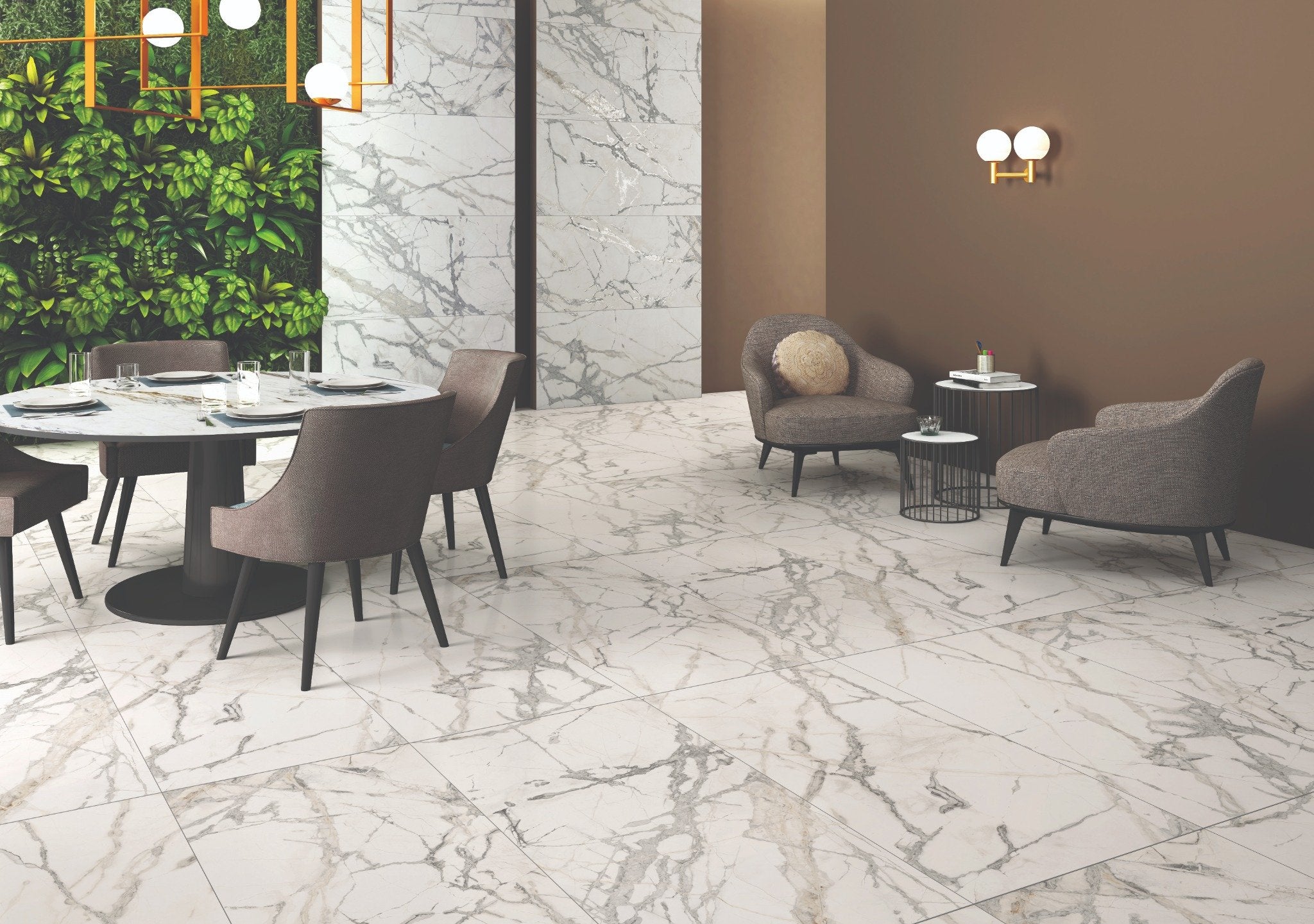 Polished marble-look flooring for a bright, spacious feel. Subtle veining for a touch of organic charm. Perfectly coordinated tones to complement wood, glass, and metal finishes